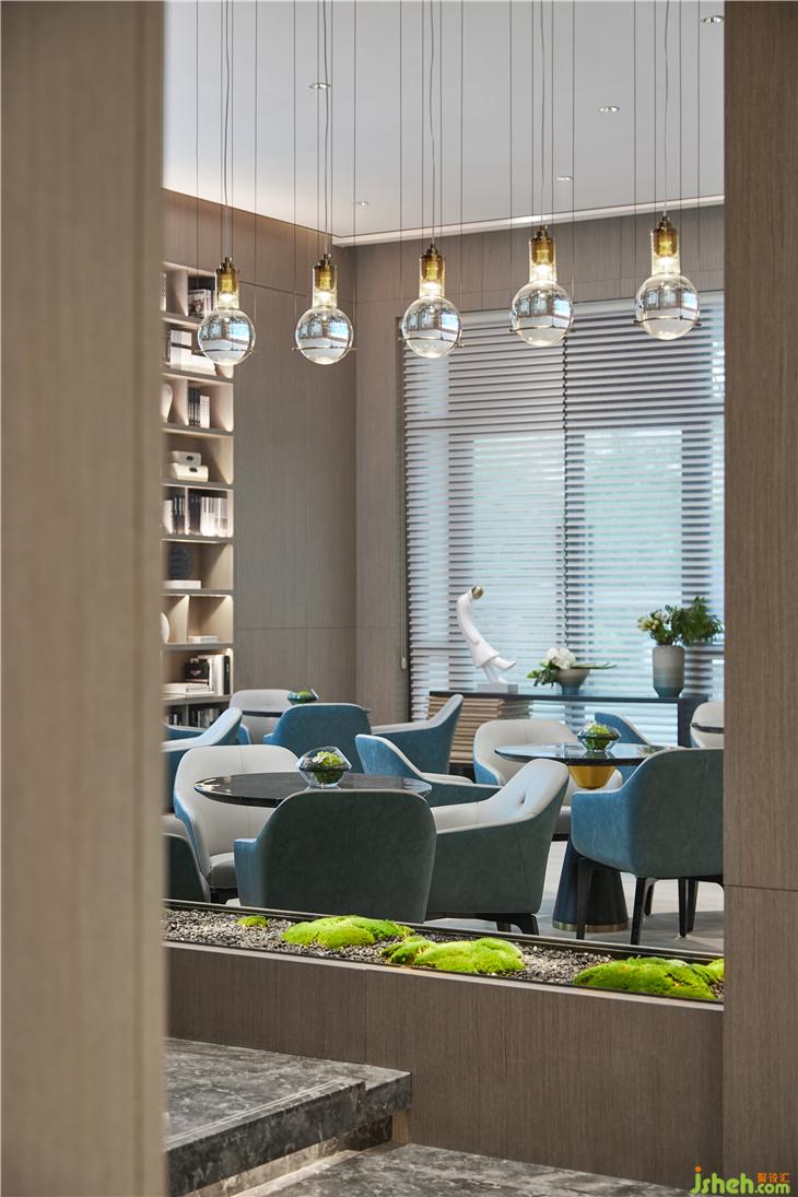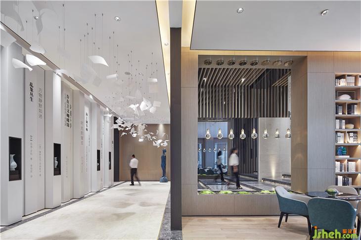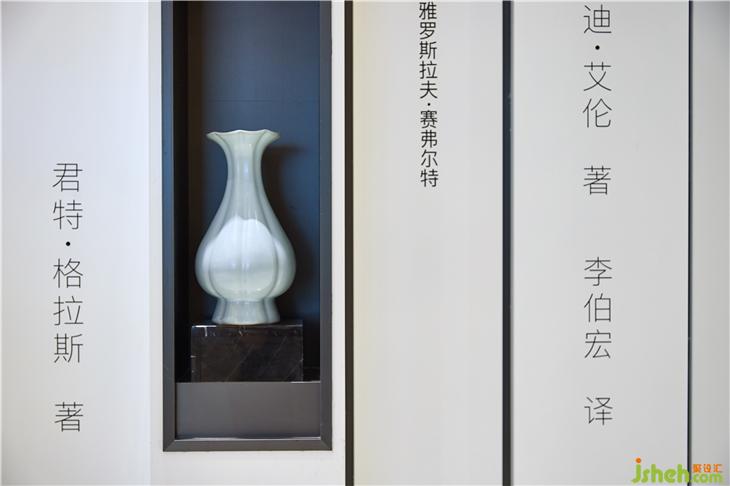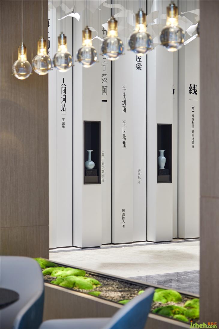 設(shè)計(jì)師通過對空間設(shè)計(jì)的升級,為這個售樓處打造了一個具有辨識度的藝術(shù)長廊,高三米八的書墻,以夸張的表現(xiàn)手法,營造出素雅靜逸的書苑氛圍。于書墻中嵌入裝飾柜,放置的白瓷花瓶,卻有“書中自有顏如玉”的既視感。