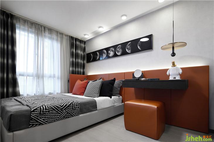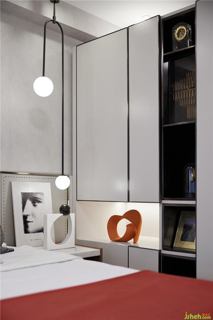 主臥用視覺上跳躍又不刺眼的赤茶色,調(diào)動了主色調(diào)灰色的沉穩(wěn)。兩處線條簡潔卻不乏味的燈飾提升了整個空間的律動感,仿佛燈光不是打在床側(cè),而是心靈的側(cè)面。