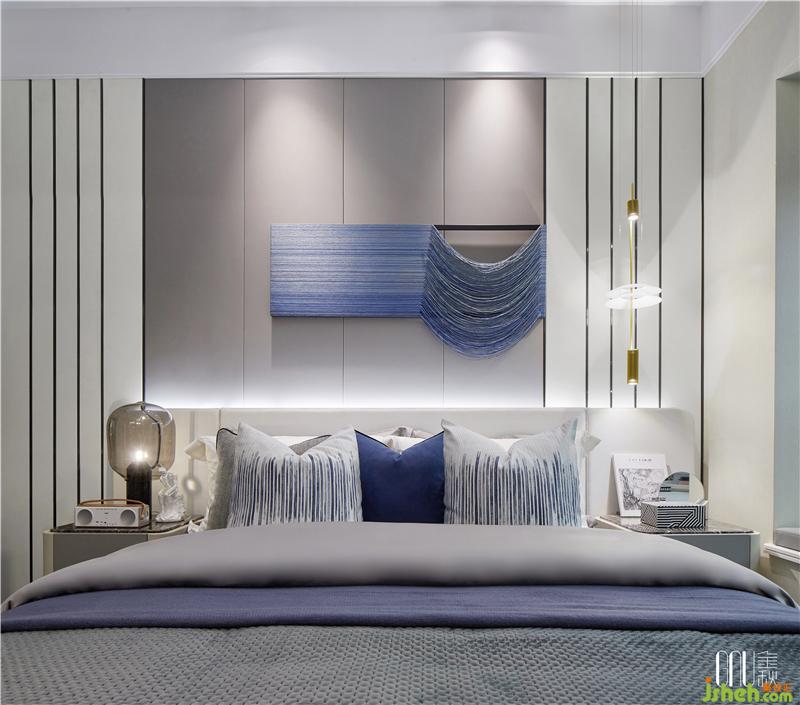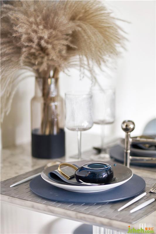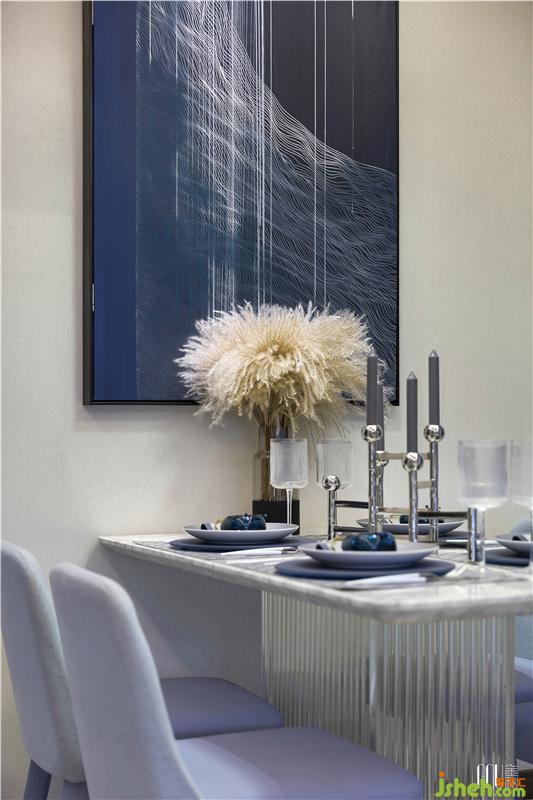 餐廳與客廳貫通而又區(qū)域分明,北歐風(fēng)強(qiáng)調(diào)室內(nèi)的寬敞度,餐廳在設(shè)計(jì)上更多選用灰與藍(lán)這類收縮色,以達(dá)到視覺上的擴(kuò)充,并采用不同飽和度的藍(lán)色增加空間的層次感。