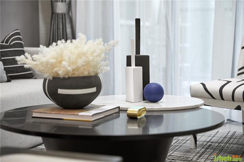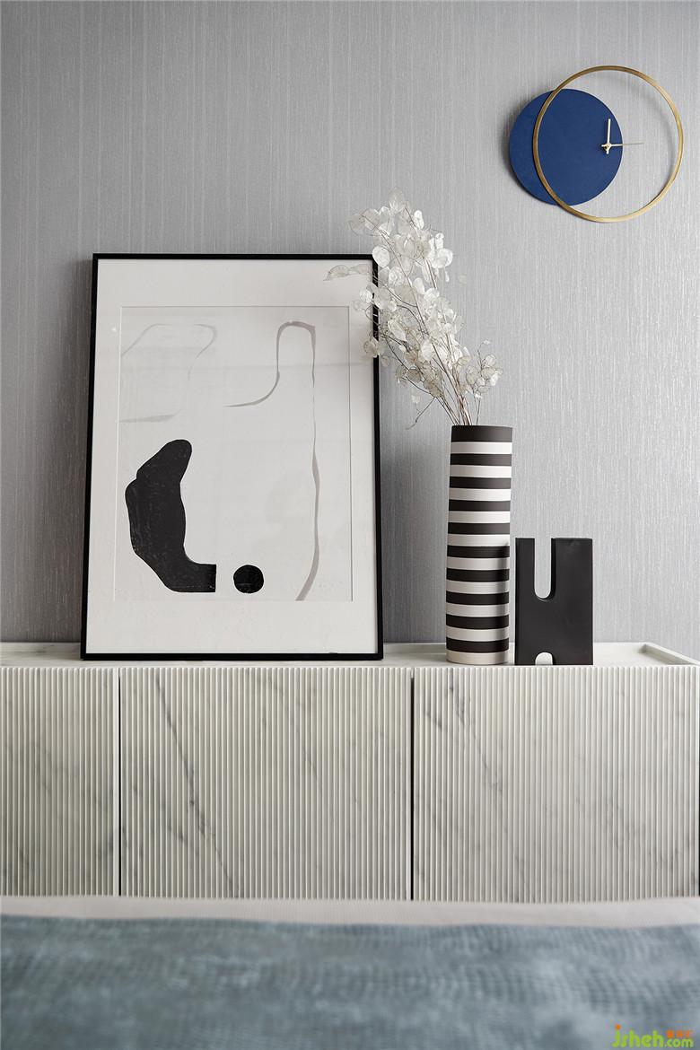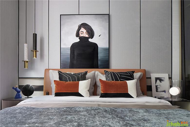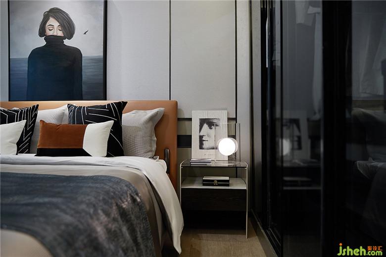 如果說客廳空間的設計相對收斂了個性的表達,主臥則在家具與飾品的選擇上,將時尚氣息充分地釋放出來。吊燈的陶瓷質感、靠墊的條紋延伸了客廳的風格,一幅吸睛的裝飾畫,把我們的思緒拉回當下,感受安靜的力量。