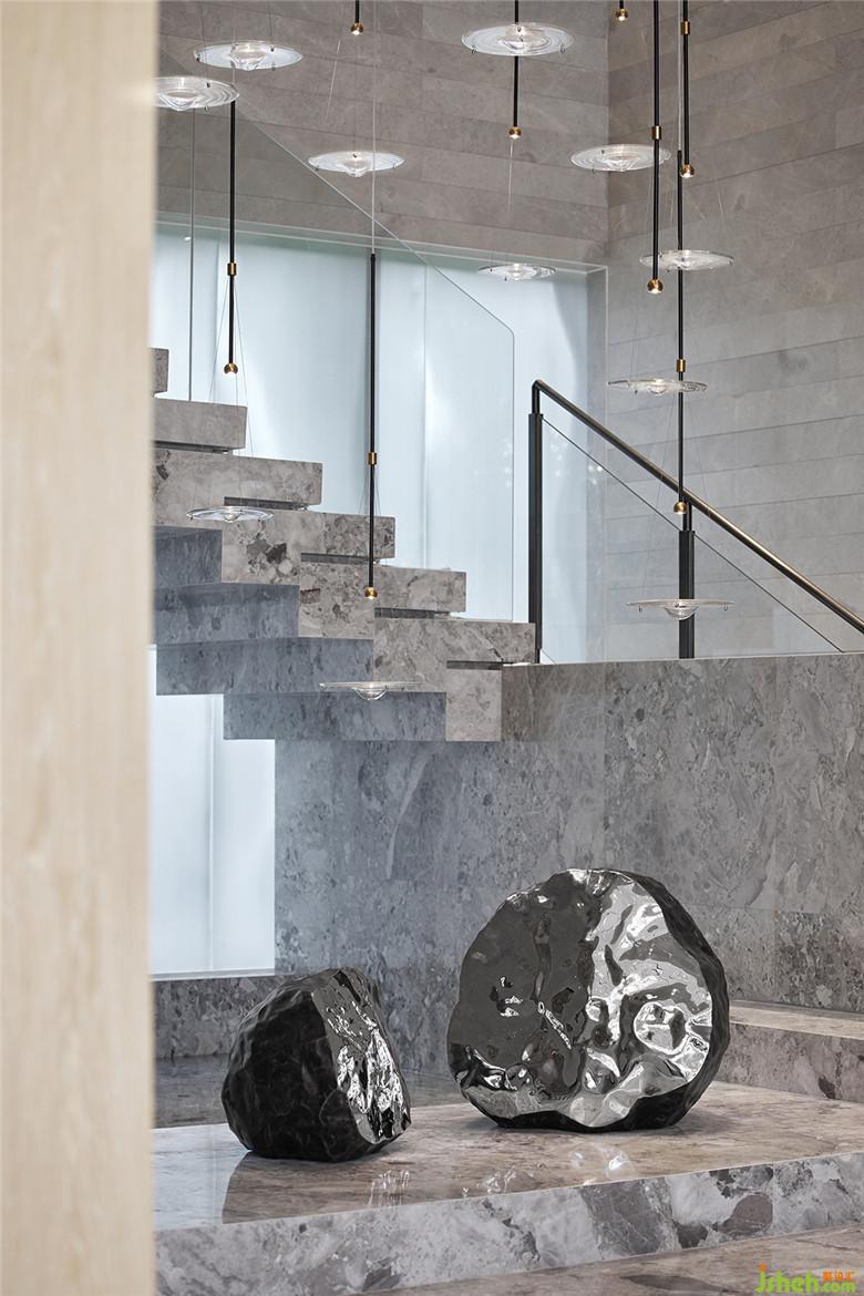 在樓梯水景區(qū),與自然融合的意境被巧妙地藏在了這里。吊燈的靈感來源于雨滴落下激起的漣漪,從水平方向上看不出端倪,但從高處往下看,仿佛真有漣漪在空氣中暈開,化成了清靈之感。