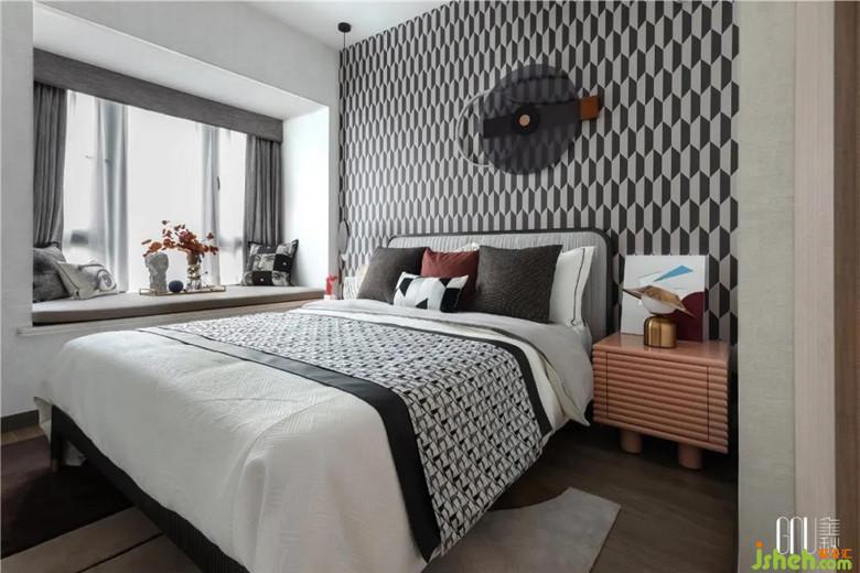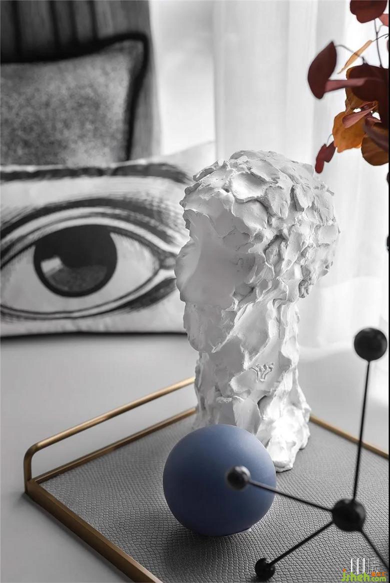暗沉中見明亮的驚喜延續(xù)到主臥的調色板中,黑白線條和不規(guī)則色塊的組合闡述多元個性。墻上掛飾和陶藝的圓形元素的加入,豐富了設計的幾何空間感。人偶造型的臺燈、陶藝和植物在床頭以及飄窗上建起浮生偷閑的一方樂園,如同置身世外桃源般,遠離喧嘩鬧市的塵埃,寧靜而舒適。
