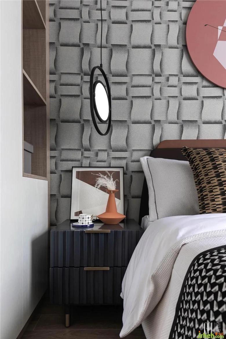 和諧是設計的至臻追求。床上靠墊隨處可見的棱角被墻面柔和的波浪線包容,剛柔并濟,演繹空間設計的靜妙和諧。