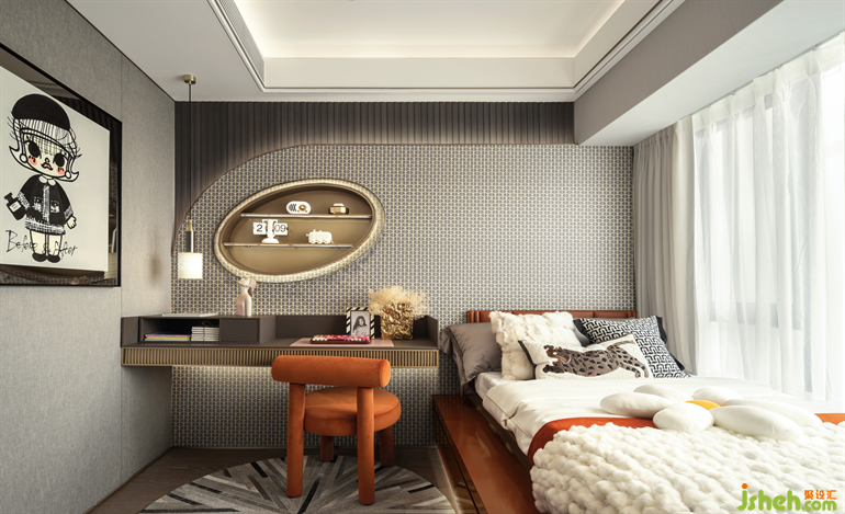 兒童房利用飄窗打造成榻榻米,釋放更多的空間,樣板房設(shè)計營構(gòu)更加舒適的使用感。玩趣的造型,多元的肌理,構(gòu)成天真浪漫的生動敘事。
