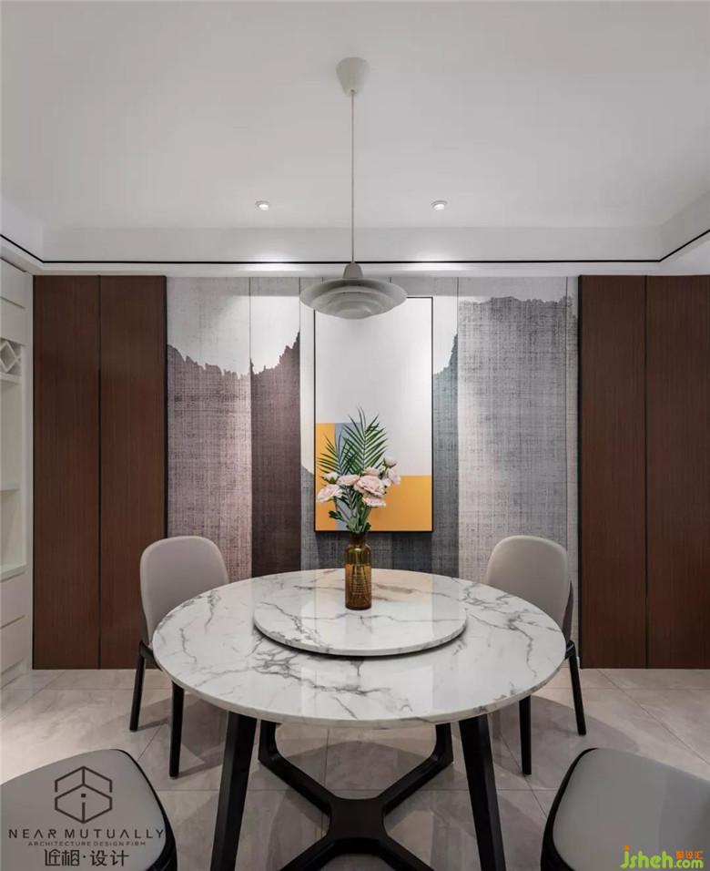 考慮到在家里聚餐的頻率較高,此區(qū)域又是方正的空間,就放置了圓形餐桌,也比較適合中式就餐。