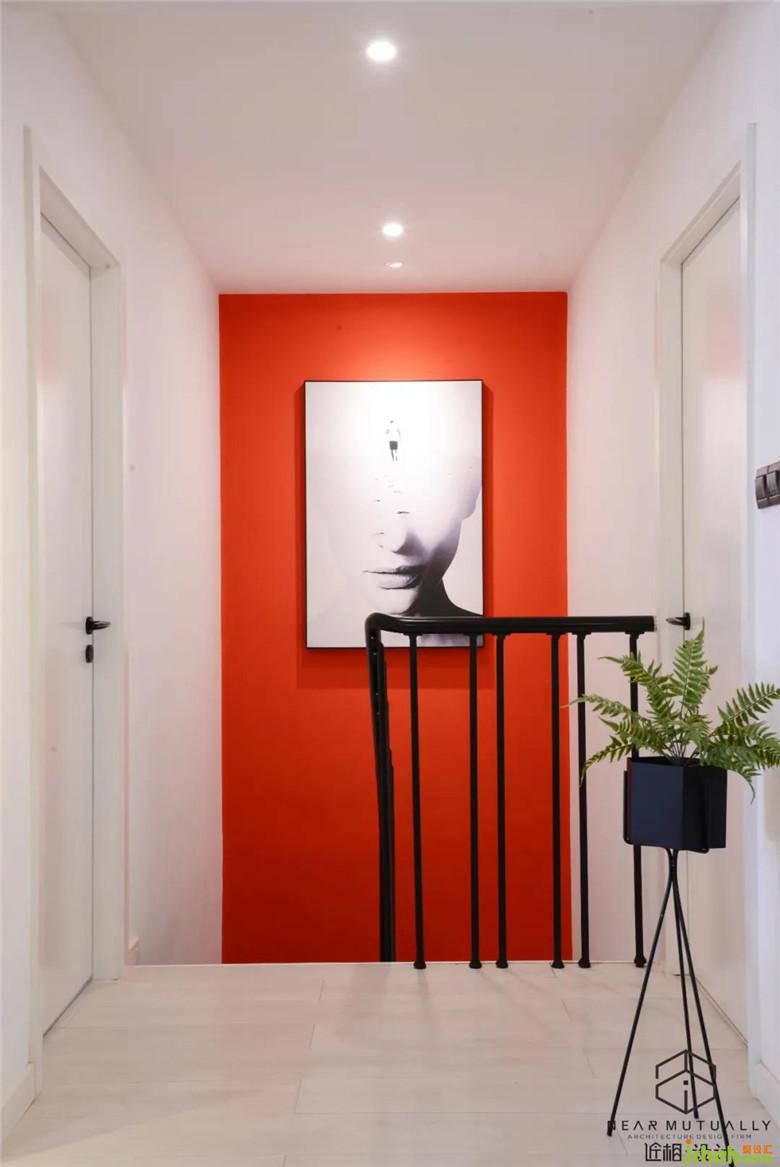 樓梯間用大紅色做出跳色,裝修公司讓簡單的空間有更多的視覺可能,與樓下背景墻產(chǎn)生對比,跳出了傳統(tǒng)極簡的冷色調(diào)。