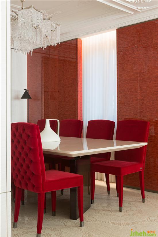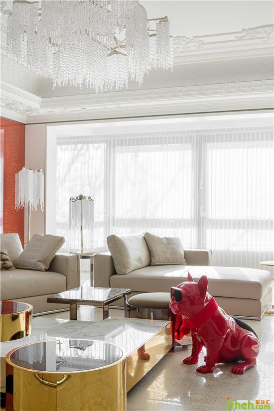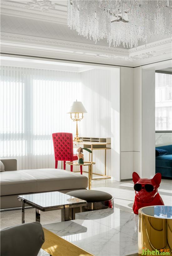 家,是與家庭成員生活在其中的舒適場(chǎng)域,而白色是現(xiàn)代都市風(fēng)格的靈魂,更是映襯客廳寬闊尺度與自然光線的絕佳色調(diào)。私宅設(shè)計(jì)在白色調(diào)的基礎(chǔ)上雕花,描摹細(xì)節(jié)的藝術(shù),同時(shí)以小范圍點(diǎn)綴的形式,將濃烈而華麗的紅調(diào)注入空間之中,打破了純粹當(dāng)代的刻板氣息。絲絨單椅、皮質(zhì)沙發(fā)、漆面小狗擺件、水晶流蘇燈飾、描金藝術(shù)裝置畫......空間中的一切組合相互融合,注入一抹活潑靈動(dòng)的氣韻,讓居者同時(shí)品味生活的藝術(shù)感與煙火氣。
