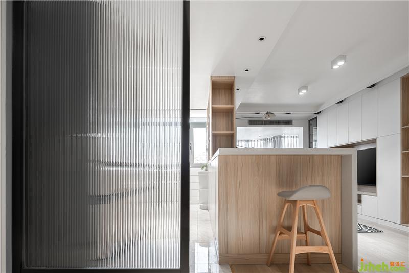 原本房子是沒有玄關(guān)的,離電梯門很近,如果開門沒有遮擋,顯然不盡人意。要是強(qiáng)制增加隔斷,又容易破壞寬敞空間的大好采光。所以在入門玄關(guān)的位置,北京室內(nèi)設(shè)計師加入了單扇的長虹玻璃。既能滿足單向采光進(jìn)入玄關(guān),透光不投影的隔斷也具備遮擋性。營造光影的效果從開門起,就成為左鄰右舍羨慕嫉妒的房子,是空間最恰當(dāng)?shù)恼Z言。