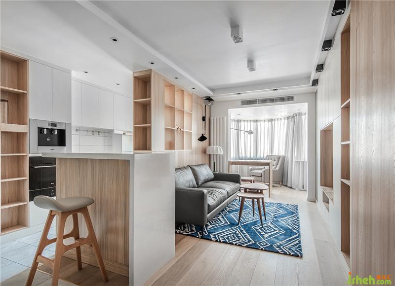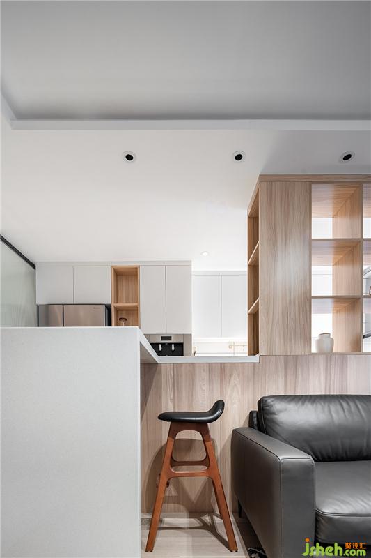 干凈的白色石材與柜板做了內(nèi)嵌,單純得簡單。作為廚房和客廳,客廳與餐廳之間的過度功能,吧臺顯然有著不錯的獨(dú)特作用。沙發(fā)和吧臺之間有一段800mm的距離,方便對坐吧椅擺放。