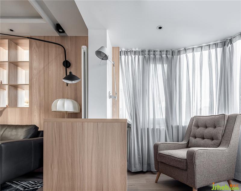 延續(xù)客廳元素風(fēng)格,在陽臺埡口做了一個很簡單的直角寫作臺,作為MrWrong辦公和吸煙的位置?;⌒苇h(huán)繞的窗戶,也極大程度的滿足了通風(fēng)的作用。特別是清晨的陽光下,愜意風(fēng)流。