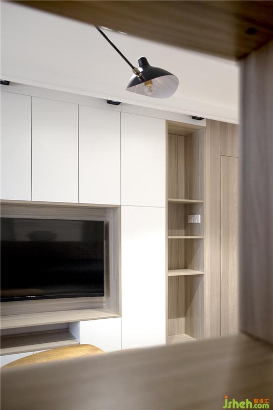 利用櫥柜,收納,動線綜合組成設(shè)計(jì)的吧臺,讓空間達(dá)到更有效的使用。轉(zhuǎn)角吧臺上有一段書柜,180°的三向開口,讓擺放的形式不單一。