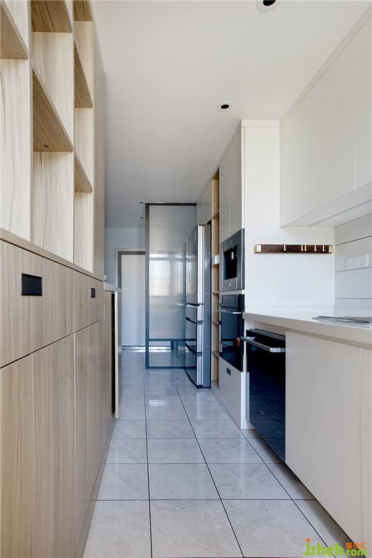 墻面和所有訂制材料都嚴(yán)格把控誤差,避免過道距離被壓縮,加上兩旁無把手的櫥柜,才得以實(shí)現(xiàn)900mm的寬敞距離。廚房唯一的單面采光,可以直接通過對面的長虹玻璃,為玄關(guān)解鎖不錯的自然光線。