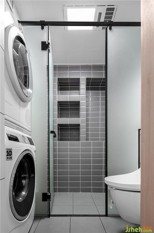 還是借助墻體被掏出來的部分,在衛(wèi)生間里滿足了洗衣機(jī)+烘干機(jī)的擺放。既不占用過道空間,還使多余的面積甚至是墻厚部分,都得到了利用。