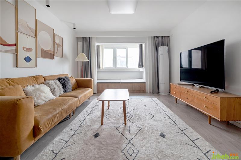 沙櫻桃木的家具與焦糖色的沙發(fā)相得益彰,配色讓整體的空間更加融洽,沙發(fā)背景沒有做復(fù)雜的處理,屋主自選了幾副裝飾畫點(diǎn)綴。淺灰色的復(fù)合地板,搭配白麻地毯,提升了不少舒適性。