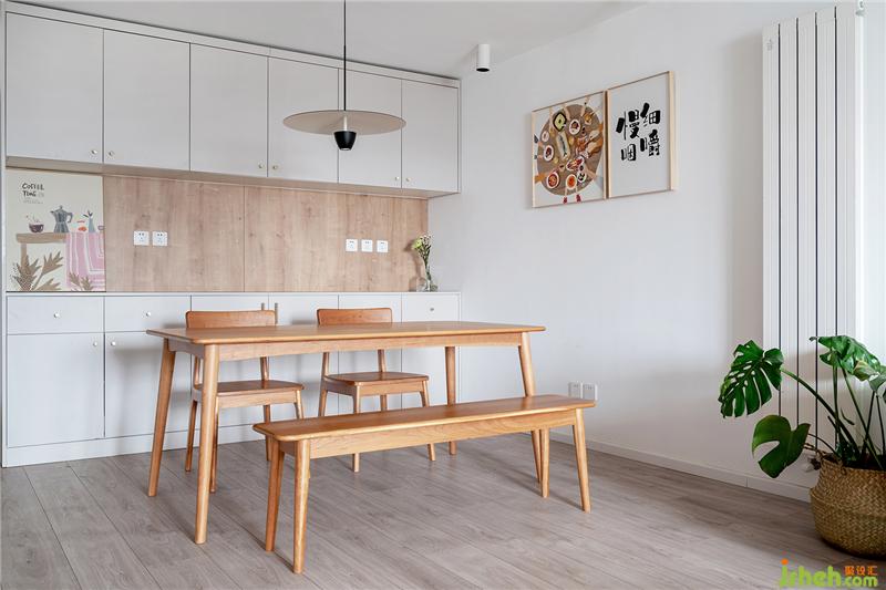 餐廳一側(cè)做了整組柜體,釋放一部分廚房操作臺(tái)功能,還增加一部分整屋的收納空間。中間臺(tái)面區(qū)域,可以擺放一些小家電以及一些裝飾品。