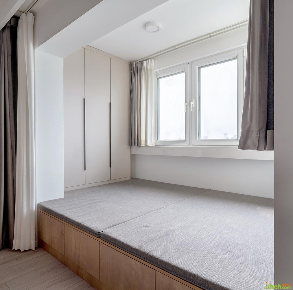 在床頭擺放了一組紅色的書柜,地臺(tái)床頭柜,還讓收納翻倍。