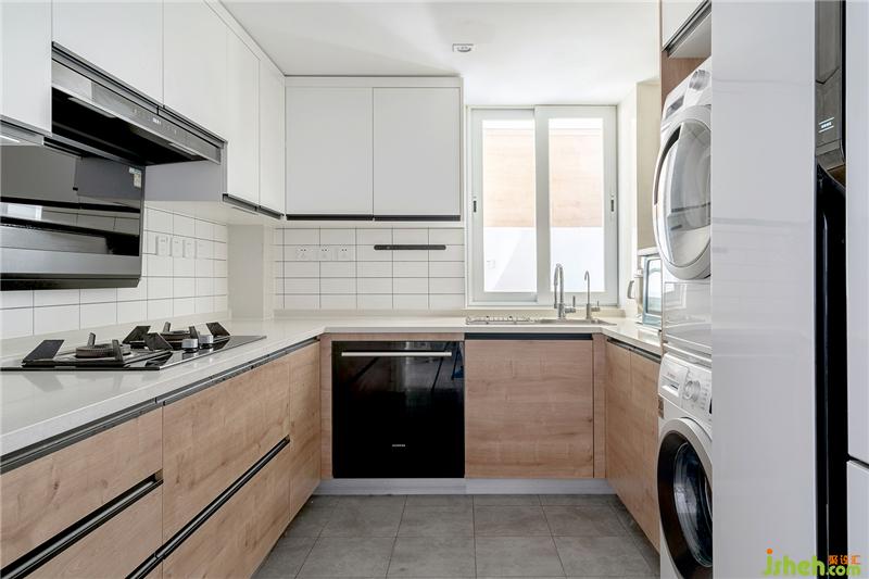 廚房墻面小白磚讓整個(gè)空間更加的白凈,地面深灰色瓷磚,平衡了沉穩(wěn)的效果。白色的吊柜與原木底柜搭配,簡(jiǎn)單自然。