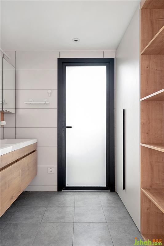 衛(wèi)生間過(guò)道全景,黑色鈦鎂合金磨砂玻璃門,與白色瓷磚形成了黑白配。衛(wèi)生間整體以簡(jiǎn)潔為主,搭配兩三片花色磚提升清新質(zhì)感。