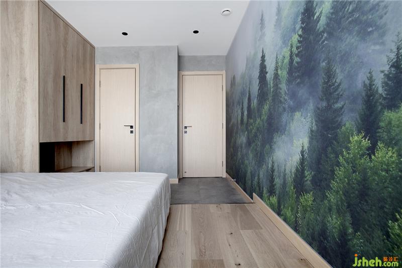 床正對面設計了一面森林壁畫,加大了屋里的視覺感,同樣也提升了整體氛圍,大自然的魅力是永不過時的。