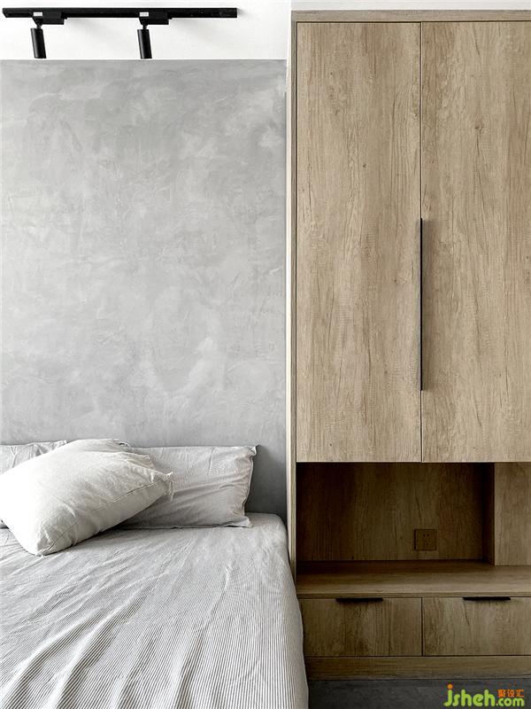 衣柜的設計同樣也是別有用心,挨著床的高度設計成落空的,首先這樣可以解決在床上隨手放置的物品,其實最重要的也是視覺上的,床頭這里不會因為這個通高的衣柜顯得壓抑。開放格里放置了感應的燈帶,起夜的時候也是一個夜燈的裝置。