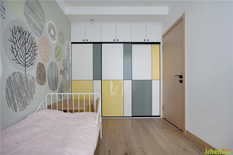 衣柜柜門用了色塊拼貼的方式來(lái)制作的,這樣和壁紙的色系相同,同樣也調(diào)劑了小空間的沉悶。