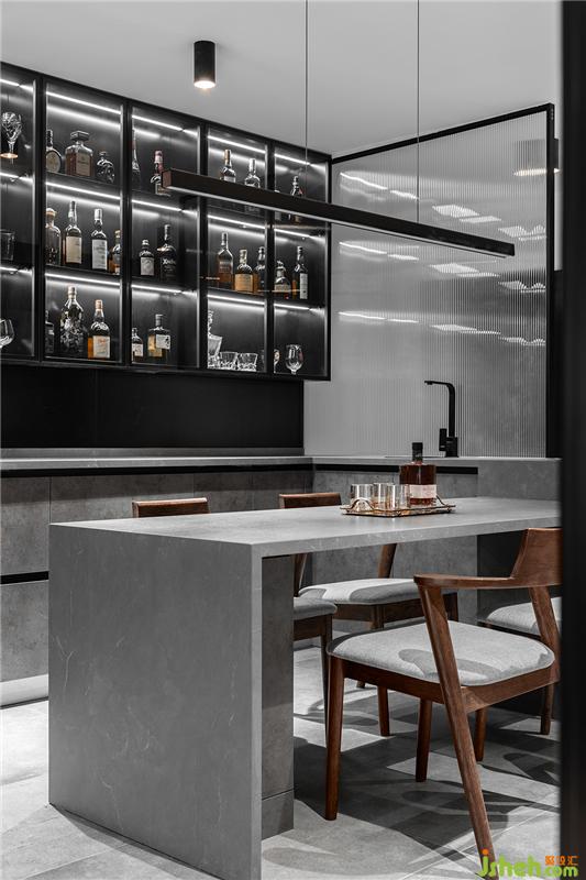 Mr.尹有很多藏酒,所以在西廚臺(tái)面上方做了大量的酒架,為了便于打理安裝了玻璃材質(zhì)的柜門,柜內(nèi)安裝燈帶照明,各式酒類琳瑯滿目,實(shí)用與美觀的廉顧得以完美體現(xiàn)。