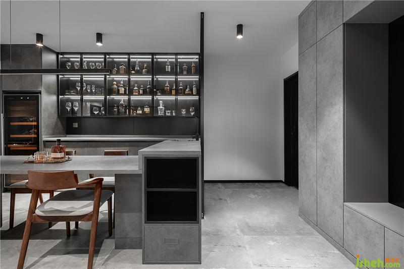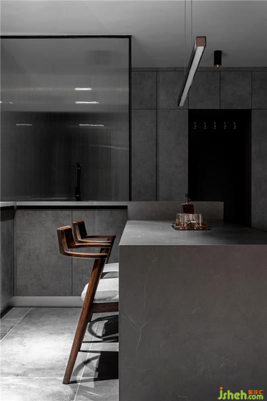 中廚區(qū)大量的底柜與吊柜具有很強(qiáng)的收納能力,水泥灰色的柜門與整體風(fēng)格統(tǒng)一。黑白灰是亙古不變的經(jīng)典顏色,靈活運(yùn)用連廚房也可以變得很高級(jí)。