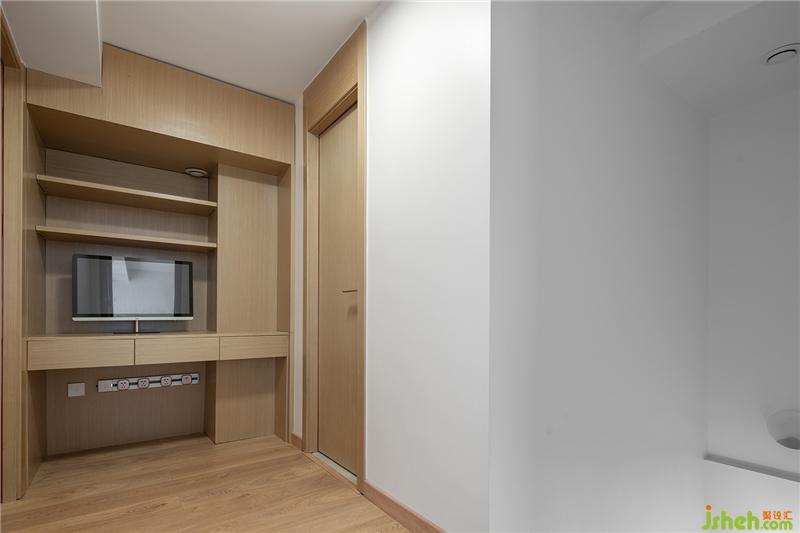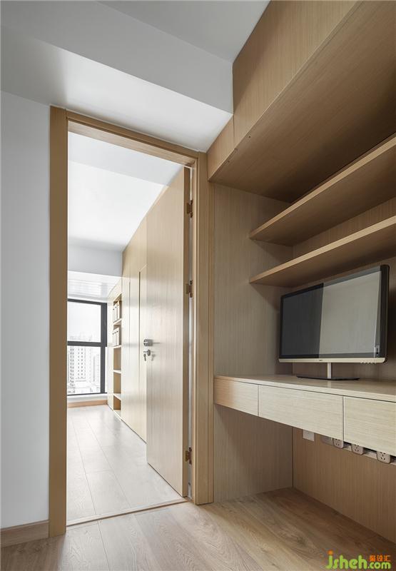 打開兒童房的門,兒童房的光線可照到走廊的辦公區(qū)域,兒童房門套與書桌之間不是嚴(yán)詞合縫,門套增加一條余量正好可以彌補這段距離,使整體變得美觀。