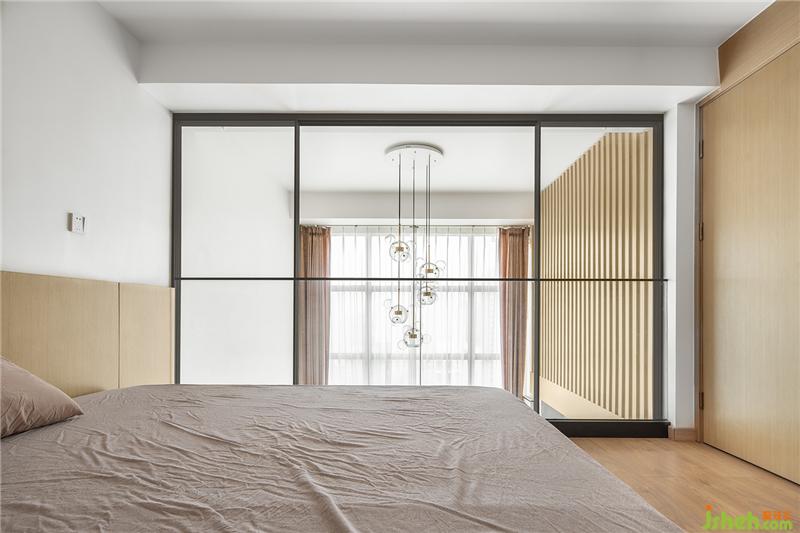 二層主臥與客廳之間安裝了玻璃推拉門,起到了隔音作用,不休息時可拉開推拉門,保證屋內(nèi)的空氣流通。