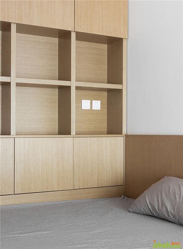 地臺一側(cè)定制了儲物開放格,50mm厚度板材用做開放格支撐,牢固穩(wěn)定,能夠擺放一些沉重物品,開放格靠近地臺預(yù)留插座面板,日常居住使用時可隨手充電。