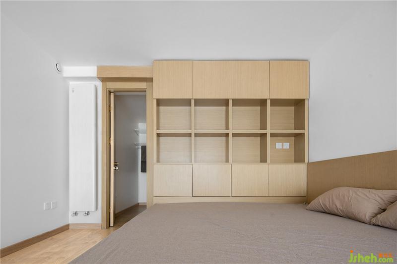 主臥中包含一間凈深2550mm儲物間,儲物形式?jīng)]有選用尋常的柜體,而是選擇簡單的白色鐵藝框架,雜物擺放形式多樣化,足以收納夫婦二人平時的生活物品。主臥儲物柜上方將空調(diào)藏入柜體中,使用時將液壓桿撐起,不使用時看似一個整體,最化程度弱化空調(diào)的存在。