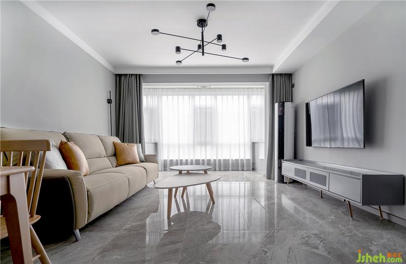 客廳區(qū)域灰色地磚飾面墻面顏色立邦漆(太空漫步),窗簾布藝為抹茶綠,客廳沙發(fā)芝華士頭等艙材質(zhì)為(科技布)防止貓咪抓撓,整體沒(méi)有太多的裝飾。