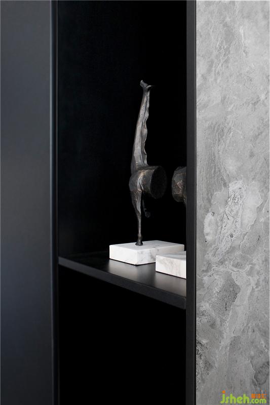 吧臺后方利用墻體做了到頂?shù)氖占{柜,中間留空部分可放置一些小擺件,儲物功能多樣化。石材吧臺與啞光石材地面反射出的光影給人帶來一絲高冷的氣息。