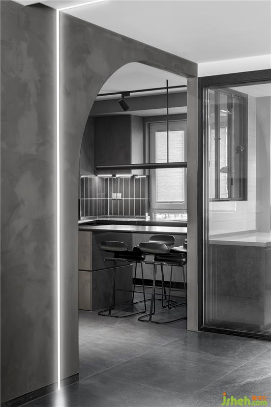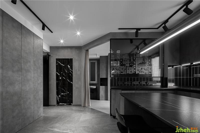 西廚區(qū)選擇軌道射燈與吊柜下方的感應(yīng)燈輔助照明,使空間內(nèi)沒有暗角,餐桌吊燈平視時看不到底下的光源,避免對視覺上的刺激。操作臺一側(cè)的墻面安裝科技感十足的軌道插座,讓制作美味的過程充滿靈活性。