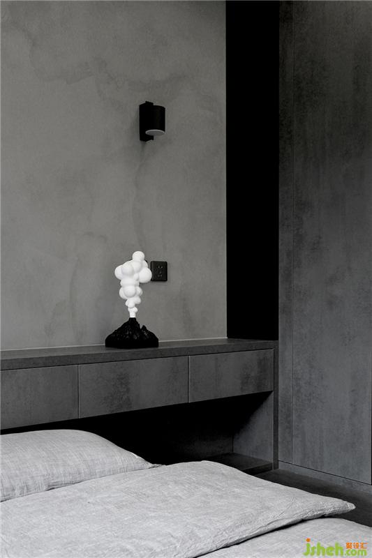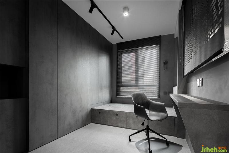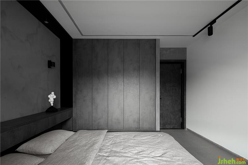 整體空間沒有太多雜色,中灰色調(diào)占領(lǐng)主導(dǎo)地位,衣柜柜板選擇灰色的木紋材質(zhì),仿水泥的自然肌理非常有質(zhì)感。由于柜板高于2m,內(nèi)部需要安裝拉直器防止變形。為了保證整體的統(tǒng)一,臥室地面與空間色調(diào)一致,仿布紋的地磚在柔和視覺的同時(shí)能夠緩解四周硬質(zhì)的感覺。