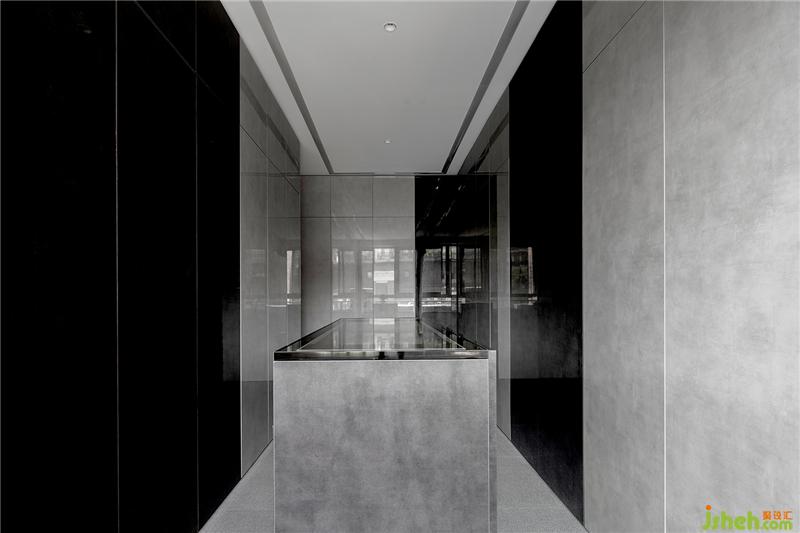 又是三種灰色系材質(zhì)搭配的空間。衣帽間柜門的鏡面效果反射產(chǎn)生的光線對空間進(jìn)行提亮,搭配中間水泥色首飾柜時(shí)刻透露出優(yōu)雅的氣息。