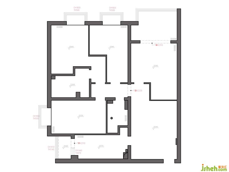 3.過道空間門洞較多,臥室墻體雜亂無章,難以擺放成品家具,影響采光且浪費很多空間,使得很多功能需求難以實現(xiàn)。