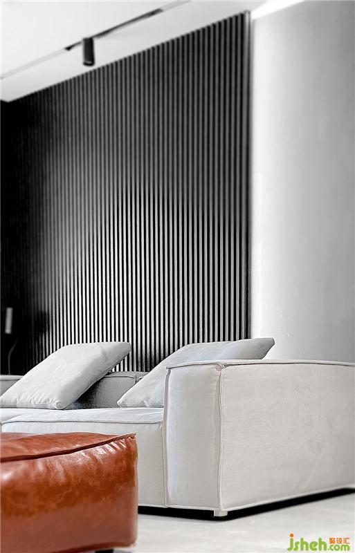 到頂?shù)暮谏珜嵞驹煨桶逵米錾嘲l(fā)的背景墻,板面經(jīng)過開槽加工處理,側(cè)邊安裝線性燈帶,具有科技感。