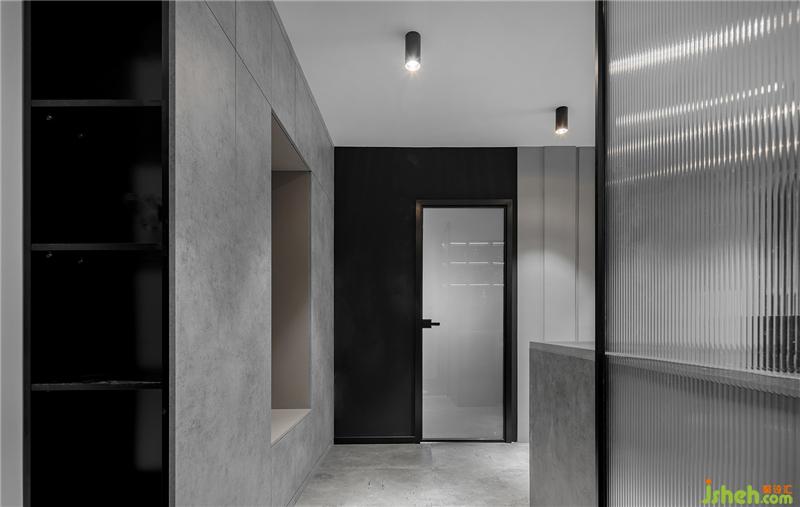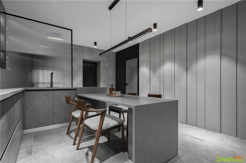 中廚區(qū)大量的底柜與吊柜具有很強的收納能力,水泥灰色的柜門與整體風格統(tǒng)一。黑白灰是亙古不變的經(jīng)典顏色,靈活運用連廚房也可以變得很高級。