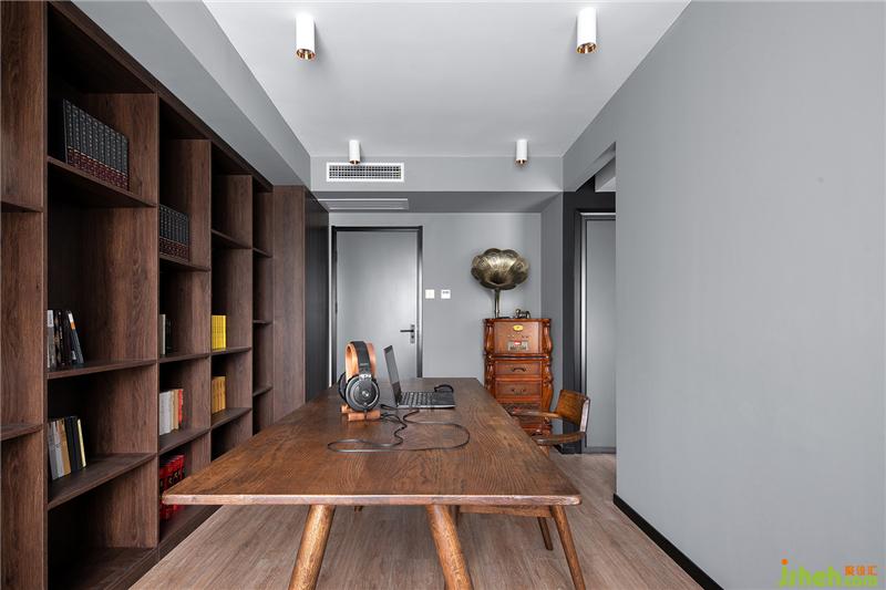 書房區(qū)域一側(cè)做了整面墻深胡桃木色收納柜,中間部分定制為開放格書架,使業(yè)主收藏的大量書籍得以擺放。