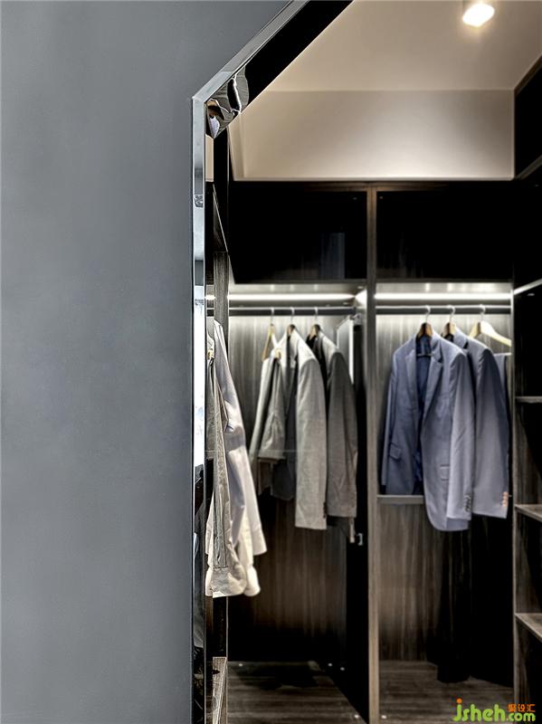 衣帽間與主衛(wèi)門的墻面涂刷了黑色墻漆,與黑色門套與啞口顏色整體統(tǒng)一。
