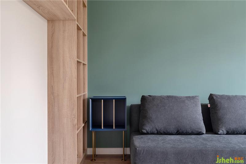 沙發(fā)背景墻涂刷了莫蘭迪色系墻漆,搭配深灰色沙發(fā)床給空間帶來寧靜祥和的氛圍。擺放在角落的深藍色邊幾小巧而獨立,具有收納能力的同時充斥一絲高級感。