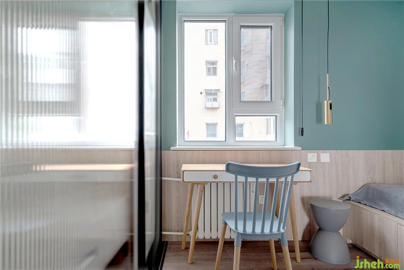 書桌一側(cè)的衣柜選用鈦鎂合金窄邊框長虹玻璃推拉門,顏值超高通透感十足。安裝在書桌下方的散熱片要提前考慮好尺寸,避免產(chǎn)生不必要的尷尬。