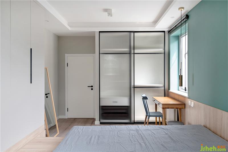 黑白灰加以木色,滿滿的北歐風(fēng)令人感到寧靜祥和,床頭墻上方淺墨綠色的墻面為空間增加一抹亮色,作為空間的點(diǎn)綴。