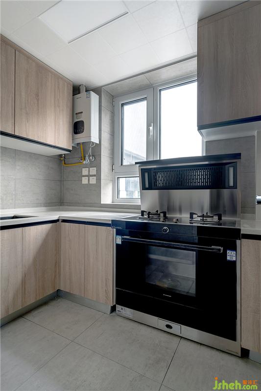 廚房采用高級灰的墻磚與原木色柜體相結(jié)合,搭配白色石英石臺面,使得風(fēng)格更自然純樸。集成灶是小廚房的福音,它能夠省出不少的吊柜空間,非常劃算。