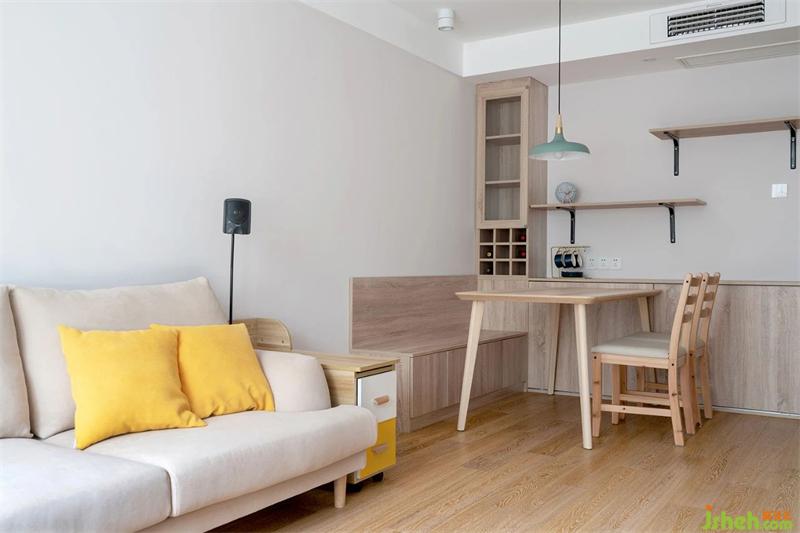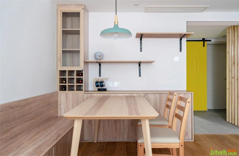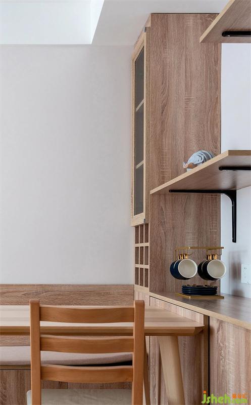 卡座一直是小戶型的不二之選,空間利用絕對高,還能增加儲物和收納。餐桌邊上設(shè)計了餐邊柜,平時的一些小電器方便使用,紅酒還有收藏的一些杯子也有空間展示。