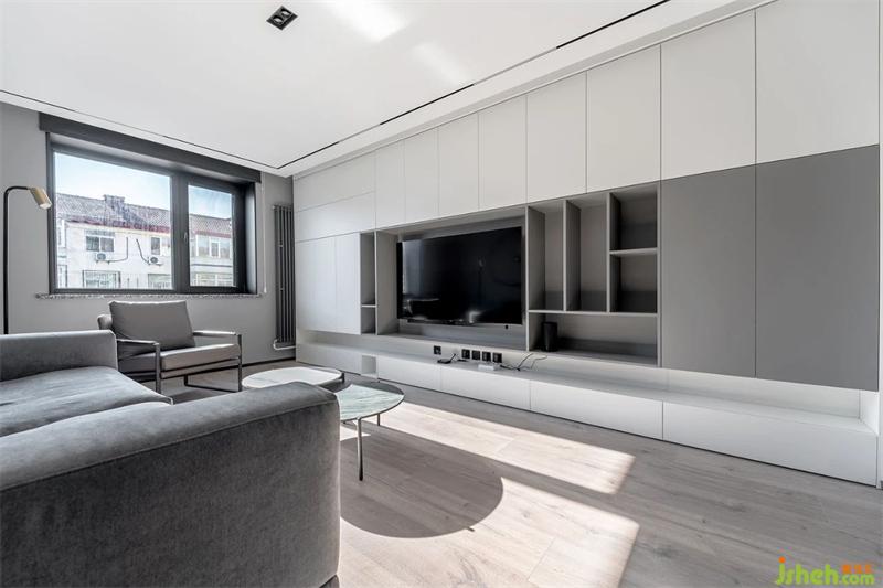 3.客廳采用了儲(chǔ)物式電視背景墻作為裝飾,充分滿足了住戶的收納需求。