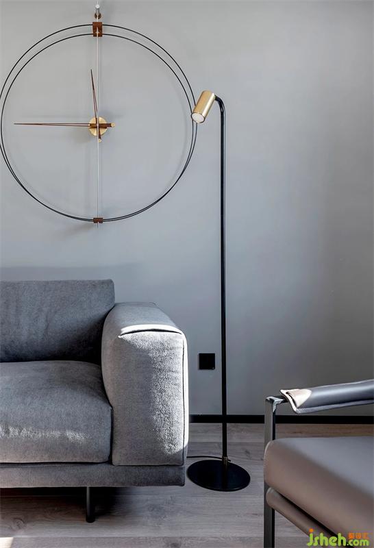 沙發(fā)背景選用簡(jiǎn)約的鐵藝掛鐘作為裝飾,搭配金屬質(zhì)感的落地?zé)?,顯得簡(jiǎn)約又大氣。