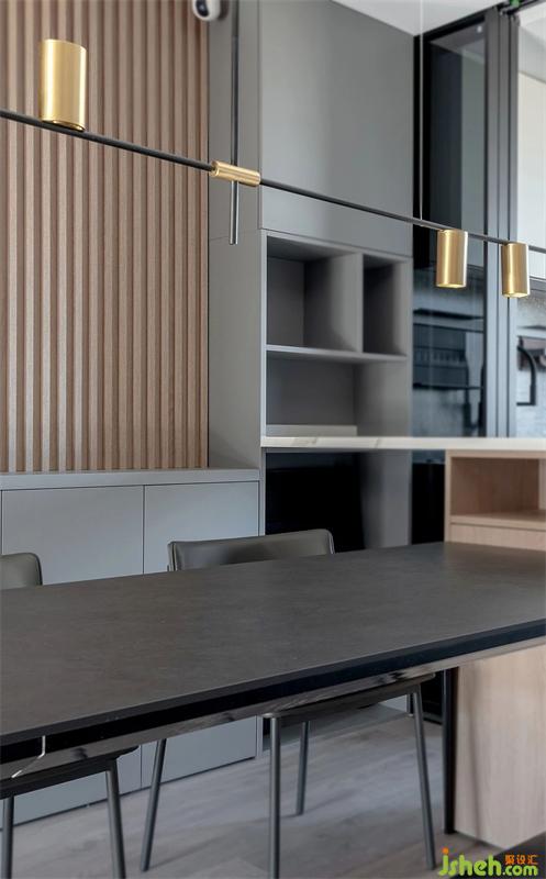 餐廳的餐桌選用巖板材質(zhì),搭配風(fēng)格簡(jiǎn)約的金屬吊燈,彰顯極具現(xiàn)代設(shè)計(jì)的美感。黑色的餐桌椅與黑暖色的光源形成對(duì)比,巖板所帶來的自然高級(jí)感,讓整個(gè)餐廚空間的氛圍恰到好處。