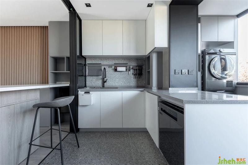 將洗衣機(jī)與烘干機(jī)挪到了廚房陽臺(tái),并用儲(chǔ)物柜進(jìn)行包裹形成一個(gè)整體。洗滌用品和晾衣工具都可以放在柜子里,讓物品可以集中存放。